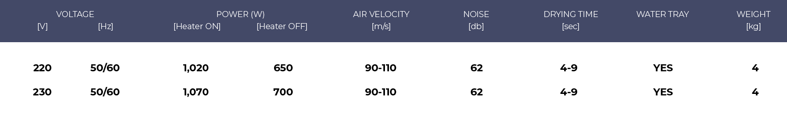 Powerful air velocity of 90-110m/s enables drying time in few seconds.
