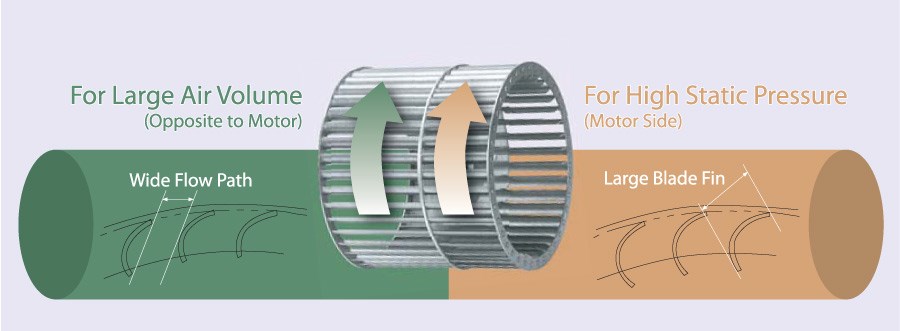 It is divided into two portions which can generate large air volume and high static pressure respectively