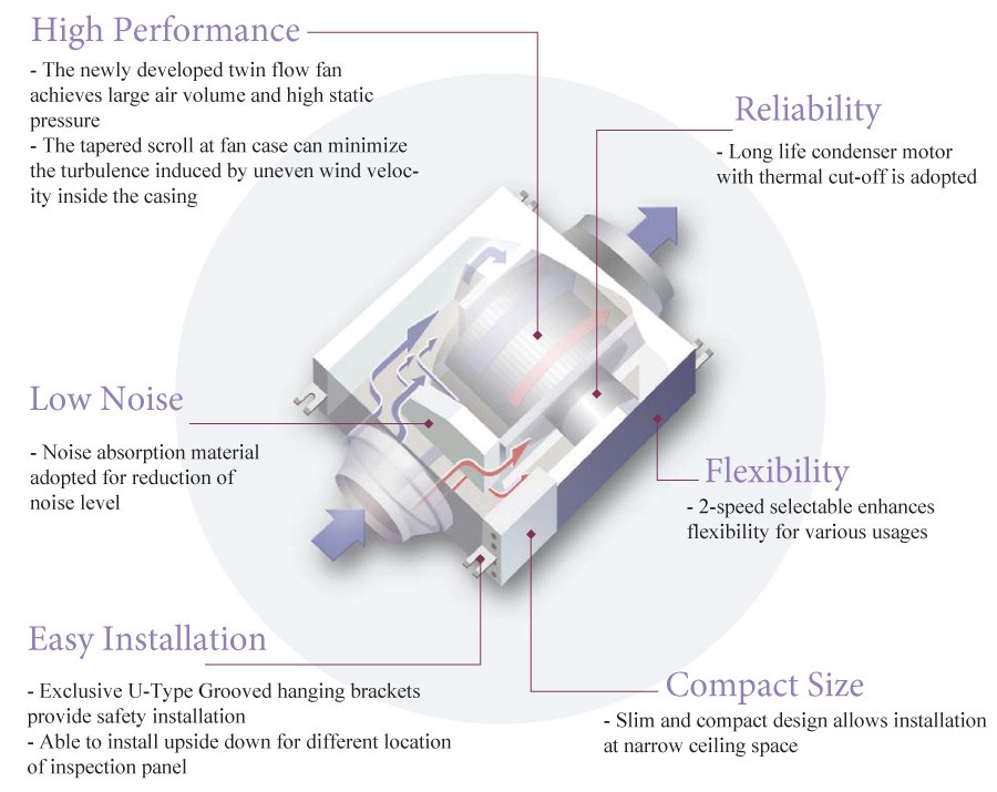 The slim, compact and light-weight structure allows easy installation at narrow ceiling space. Those units can be installed upside down, that location of inspection opening can be selected to ensure easy access for maintenance. Particular U-grooved mounting brackets prevent loosen of mounting bolts that reinforce installation safety