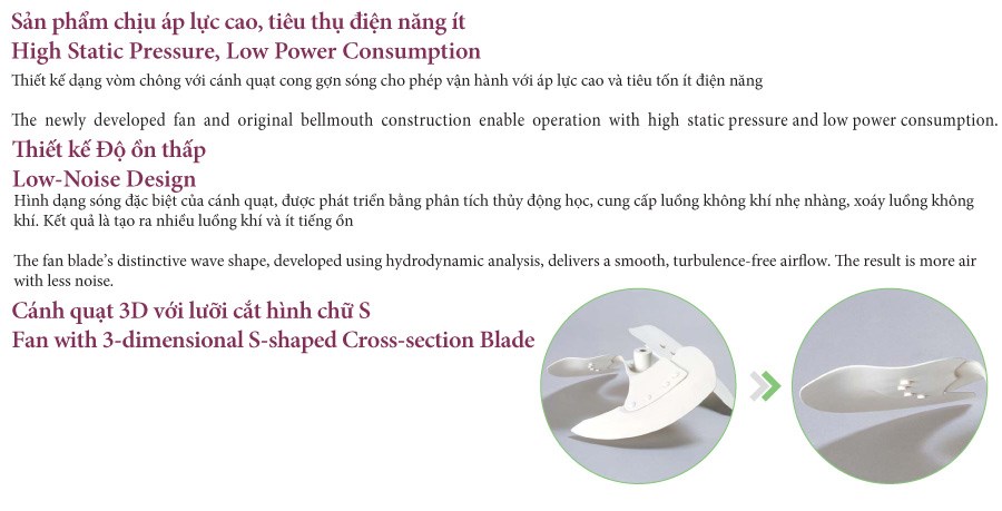 - Thiết kế dạng vòm chông với cánh quạt cong gợn song
